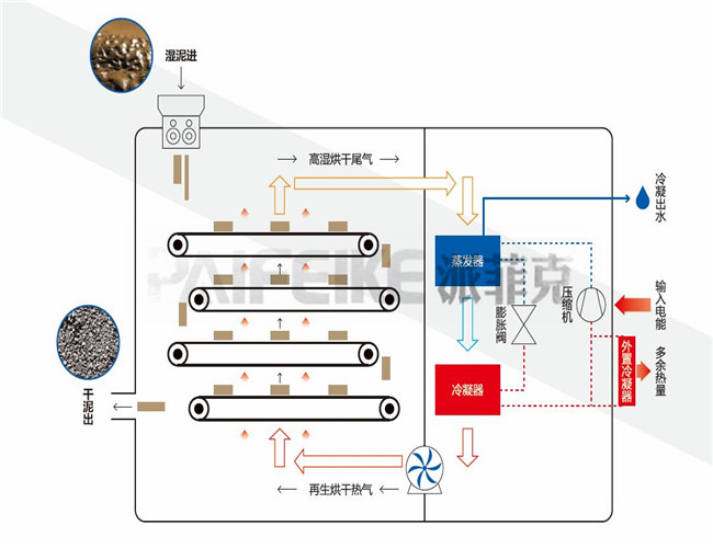熱泵低溫余熱干燥機在污泥烘干機中的應(yīng)用:低溫污泥干燥設(shè)備是基于低溫?zé)岜贸凉裨?,采用對流式熱風(fēng)干燥法對網(wǎng)格上的濕污泥進(jìn)行脫水和脫水,整個系統(tǒng)采用全封閉設(shè)計,干燥效率高。空氣無熱損失。污泥干燥設(shè)備采用熱泵技術(shù),通過傳熱和冷凝熱回收,實際效率遠(yuǎn)高于傳統(tǒng)熱風(fēng)干燥技術(shù)(蒸汽加熱或燃燒天然氣),除濕能耗可降低40%~49.99%。內(nèi)置熱回收裝置,使冷、熱效率進(jìn)行總換熱,效率更高。密閉空間的空氣循環(huán)、冷凝除濕、無余熱排放,有效地解決了污泥干燥過程中的廢氣和臭味排放問題,設(shè)備運行噪聲低(60 dB以下)。