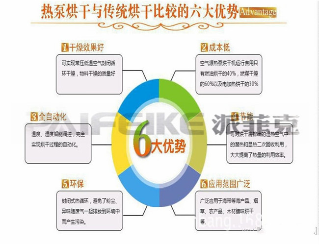 5、節(jié)能、節(jié)電:熱泵干燥機與電能協(xié)同工作。干燥成本僅為燃料干燥機的40%,燃煤干燥機的60%,電加熱設備的30%,與普通干燥設備相比節(jié)省了60%以上的能源。投資成本回收很快。